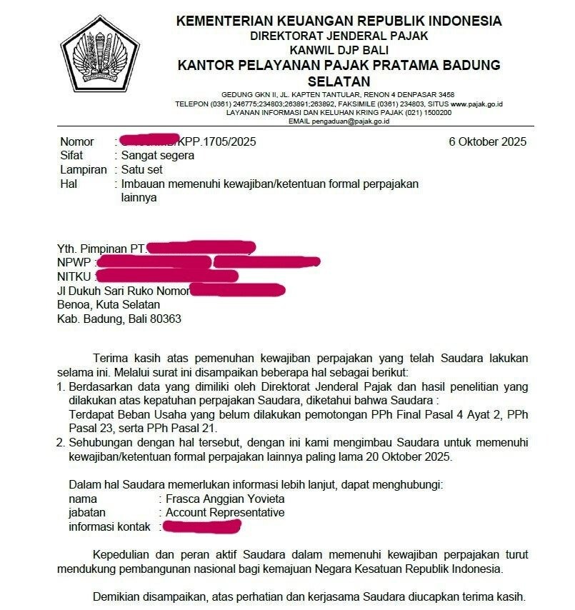 SP2DK es una solicitud oficial de la autoridad fiscal en Indonesia. En la carta, el inspector pide a una empresa o individuo que explique discrepancias en los informes o datos sospechosos. No es una multa ni una auditoría, pero sí una señal importante de que hay preguntas sobre sus documentos.