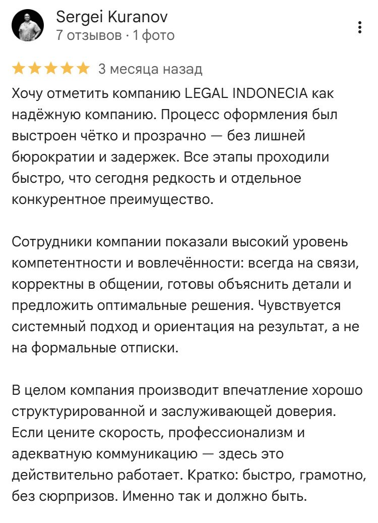 Мы ваш надежный партнер в построении бизнеса в Индонезии. Сопровождаем предпринимателей на всех этапах: от регистрации компании и открытия счёта до бухгалтерии, налогов, найма персонала и соблюдения местного законодательства. Следим за всеми изменениями в правилах и применяем их грамотно и вовремя. С нами вы избежите бюрократических сложностей и сэкономите ресурсы, сосредоточившись на развитии своего дела.